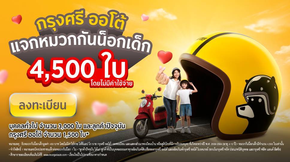 *เงื่อนไขเป็นไปตามที่ กรุงศรี ออโต้ กำหนด ผู้ที่สนใจสามารถดูรายละเอียดและสอบถามข้อมูลเพิ่มเติม โทร. 0 2740 7400 หรือ https://www.krungsriauto.com/auto/content/the-life-saver.html หรือไลน์ @krungsriauto *สิทธิ์การรับหมวกกันน็อกมีจำนวนจำกัด สำหรับบุคคลทั่วไป จำนวน 3,000 ใบ และลูกค้าปัจจุบันของกรุงศรี ออโต้ จำนวน 1,500 ใบ หรือจนกว่าสินค้าจะหมด