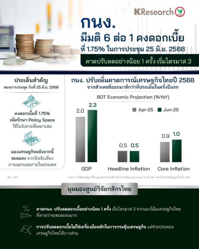 คณะกรรมการนโยบายการเงิน (กนง.) มีมติ 6 ต่อ 1 เสียง ในการประชุมเมื่อวันที่ 25 มิถุนายน 2568 ให้ คงอัตราดอกเบี้ยนโยบายไว้ที่ระดับ 1.75% โดยให้เหตุผลว่า ต้องการรักษาพื้นที่ทางนโยบายการเงิน (monetary policy space) เพื่อรองรับการปรับลดดอกเบี้ยในช่วงเวลาที่เหมาะสมและสามารถก่อให้เกิดประสิทธิผลสูงสุดในอนาคต