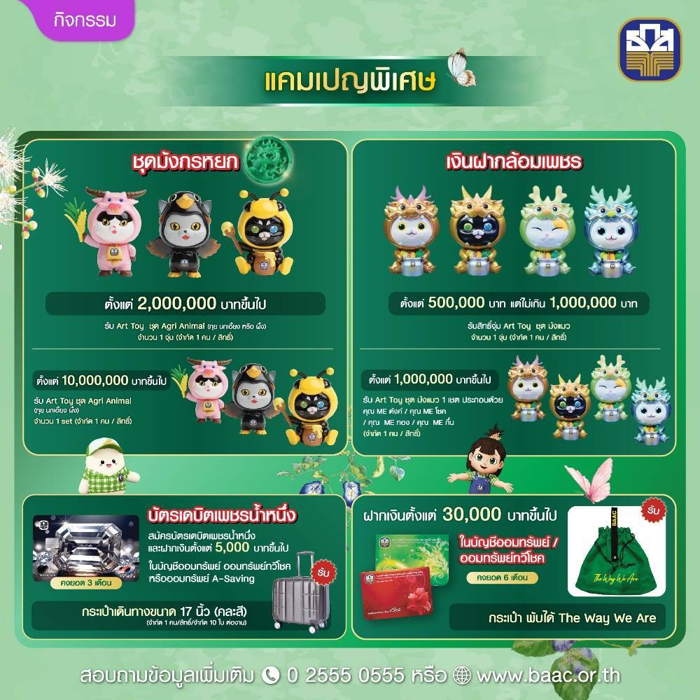 จุ่ม Art Toy ชุด AGRI ANIMAL (ทุย นกเอี้ยง และผึ้ง) จำนวน 1 จุ่ม (จำกัด 1 คน/สิทธิ์) หรือเมื่อฝากตั้งแต่ 10,000,000 บาทขึ้นไป รับเลย 3 ตัว ครบเซต (จำกัด 1 คน/สิทธิ์) และเมื่อฝากเงินฝากล้อมเพชร ระยะเวลา