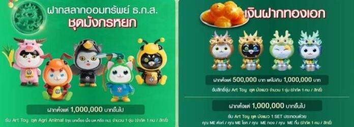 ผู้ที่ฝาก สลากออมทรัพย์ ธ.ก.ส. ชุดมังกรหยก ตั้งแต่ 1 ล้านบาทขึ้นไป จะได้รับสิทธิ์ “จุ่ม” Art Toy AGRI ANIMAL 1 สิทธิ์ทันที ซึ่งประกอบด้วย ทุย นกเอี้ยง ผึ้ง มด และกบ สัตว์สื่อความหมายถึงภาคการเกษตรอย่างน่ารัก