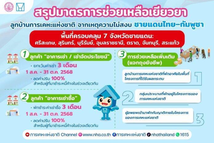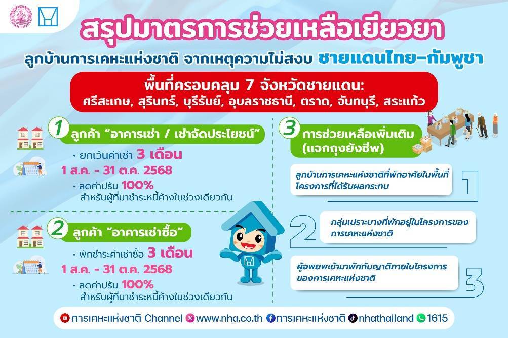 นายทวีพงษ์ วิชัยดิษฐ ผู้ว่าการการเคหะแห่งชาติ เปิดเผยเมื่อวันที่ 4 สิงหาคม 2568 การเคหะแห่งชาติพร้อมยืนเคียงข้างประชาชนในยามวิกฤติ ด้วยมาตรการช่วยเหลืออย่างเป็นรูปธรรม เพื่อบรรเทาภาระค่าใช้จ่ายด้านที่อยู่อาศัย และส่งเสริมความมั่นคงในการดำรงชีวิตของผู้ได้รับผลกระทบมาตรการเร่งด่วนให้ลูกบ้านของการเคหะแห่งชาติใน 7 จังหวัดชายแดน ได้แก่ ศรีสะเกษ สุรินทร์ บุรีรัมย์ อุบลราชธานี ตราด จันทบุรี และสระแก้ว ครอบคลุมความช่วยเหลือหลัก 3 ด้าน ได้แก่ 1. ยกเว้นค่าเช่ารายย่อยและเช่าจัดประโยชน์สำหรับลูกค้าการเคหะแห่งชาติ ฟรีค่าเช่า 3 เดือน ตั้งแต่ 1 สิงหาคม – 31 ตุลาคม 2568 รวมถึงยกเว้นค่าปรับ 100% สำหรับผู้ที่มาชำระหนี้ค้าง ในช่วงเวลาดังกล่าว 2. พักชำระหนี้กลุ่มเช่าซื้อ ลูกค้าเช่าซื้ออาคารของการเคหะแห่งชาติในพื้นที่ที่ได้รับผลกระทบ จะได้รับสิทธิพักชำระค่าเช่าซื้อ 3 เดือน ตั้งแต่ 1 สิงหาคม – 31 ตุลาคม 2568 พร้อมยกเว้นค่าปรับ 100% กรณีที่มาชำระหนี้ค้างเช่นเดียวกัน 3. สนับสนุนการยังชีพ การเคหะแห่งชาติได้จัดเตรียมถุงยังชีพเพื่อช่วยเหลือ 3 กลุ่มหลัก ได้แก่ 1) ลูกค้าที่พักอาศัยในโครงการของการเคหะแห่งชาติในพื้นที่ชายแดน 2) กลุ่มเปราะบางที่อยู่ในโครงการ 3) ผู้ที่อพยพเข้ามาพักอาศัยกับญาติในโครงการเนื่องจากสถานการณ์ความไม่สงบดังกล่าว
