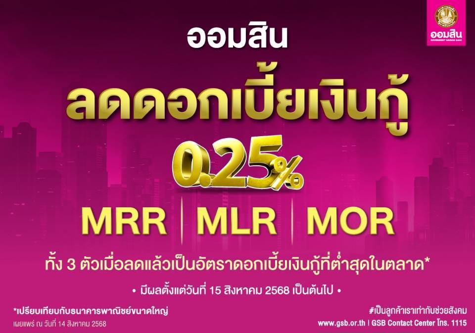 ออมสิน ประกาศลดดอกเบี้ยเงินกู้ทุกตัว 0.25% ทั้ง MRR MLR และ MOR มีผล 15 สิงหาคม 68 หวังช่วยกระตุ้นเศรษฐกิจทั้งระบบ