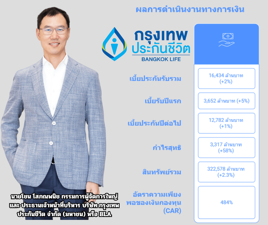 นายโชน โสภณพนิช กรรมการผู้จัดการใหญ่ และ ประธานเจ้าหน้าที่บริหาร บริษัท กรุงเทพประกันชีวิต จำกัด (มหาชน) หรือ BLA เปิดเผยถึงผลดำเนินงานในช่วง 6 เดือนแรกของปี 2568 ว่า บริษัทฯ มีเบี้ยประกันภัยรับรวมจำนวน 16,434 ล้านบาท เพิ่มขึ้นร้อยละ 2 จากช่วงเดียวกันของปีก่อน แบ่งเป็นเบี้ยรับปีแรก 3,652 ล้านบาท ซึ่งเป็นผลงานจากช่องทางตัวแทนที่เพิ่มขึ้น 24% และช่องทางอื่นๆ เพิ่มขึ้น 282% ขณะที่ช่องทางธนาคารลดลง 15% และมีเบี้ยประกันปีต่อไป 12,782 ล้านบาท
