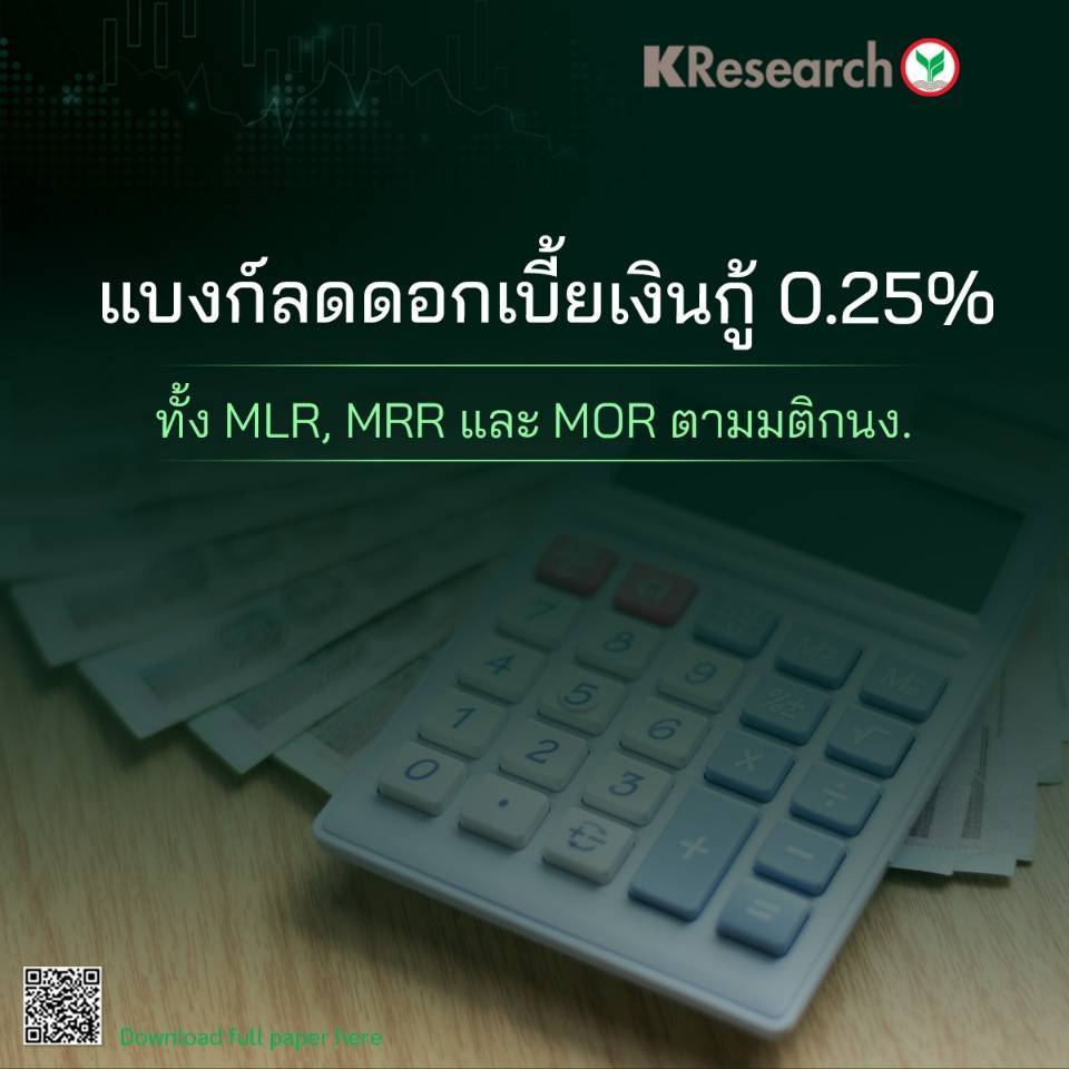📍ศูนย์วิจัยกสิกรไทย มองว่า การปรับลดดอกเบี้ยเงินกู้รอบนี้ ส่งผ่านได้ “เร็วและเต็มที่” กว่ารอบก่อน ๆ โดยขนาดการปรับลดดอกเบี้ยเงินกู้ MLR MRR และ MOR ลง 0.25% ในรอบนี้ เท่ากับขนาดการปรับลดดอกเบี้ยนโยบาย ซึ่งไม่พบบ่อยในการปรับลดดอกเบี้ยช่วงที่ผ่านมา