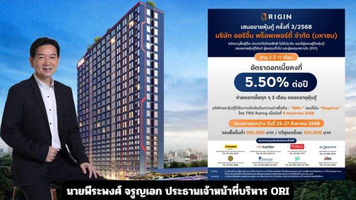 สำนักงานคณะกรรมการกำกับหลักทรัพย์และตลาดหลักทรัพย์ (ก.ล.ต.) ไฟเขียวให้ บริษัท ออริจิ้น พร็อพเพอร์ตี้ จำกัด (มหาชน) หรือ ORI เสนอขายหุ้นกู้ครั้งที่ 3/2568 แก่ผู้ลงทุนทั่วไป อายุ 2 ปี 11 เดือน อัตราดอกเบี้ยคงที่ 5.50% ต่อปี จ่ายดอกเบี้ยทุก 3 เดือนตลอดอายุหุ้นกู้ เปิดจองซื้อระหว่างวันที่ 25–27 สิงหาคม 2568 และกำหนดวันออกหุ้นกู้ในวันที่ 28 สิงหาคม 2568