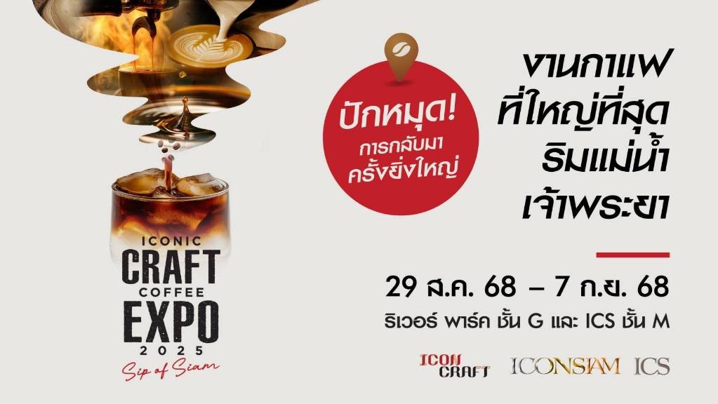 คนรักกาแฟพลาดไม่ได้ 29 สิงหาคม – 7 กันยายน 2568 นี้ มาดื่มด่ำกับกาแฟแก้วพิเศษ และร่วมเป็นส่วนหนึ่งในการขับเคลื่อนวัฒนธรรมกาแฟไทยให้เติบโตอย่างยั่งยืนใน “ICONIC CRAFT COFFEE EXPO 2025” ณ ริเวอร์ พาร์ค ชั้น G ไอคอนสยาม และชั้น M ไอซีเอส สอบถามรายละเอียดเพิ่มเติม โทร.1338 หรือ www.iconsiam.com และ Facebook:ICONSIAM