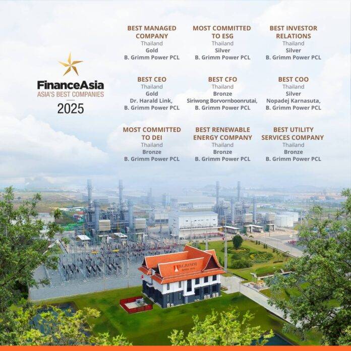บริษัท บี.กริม เพาเวอร์ จำกัด (มหาชน) หรือ BGRIM หนึ่งในผู้ผลิตและจำหน่ายไฟฟ้าเอกชนชั้นนำของประเทศไทย ตอกย้ำศักยภาพการดำเนินธุรกิจ โดยได้รับ 9 รางวัลจากการประกาศรายชื่อสุดยอดบริษัทแห่งเอเชีย ประจำปี 2568 (Finance Asia Asia’s Best Companies 2025) จัดโดยนิตยสารไฟแนนซ์เอเชีย (FinanceAsia) นิตยสารการเงินการลงทุนชั้นนำของภูมิภาคเอเชีย ซึ่งได้มอบรางวัลในหมวดต่างๆ แก่องค์กรชั้นนำของเอเชีย โดยการสำรวจความคิดเห็นของผู้จัดการกองทุน นักวิเคราะห์ และนักการเงินในภูมิภาค