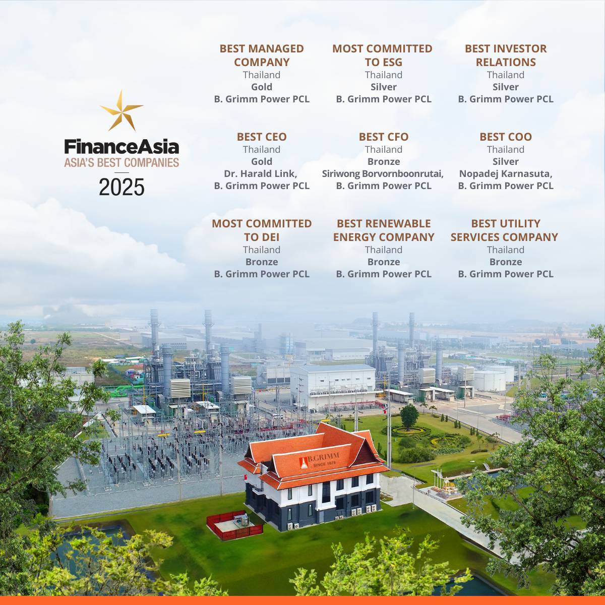 ปีนี้ บี.กริม เพาเวอร์ ตอกย้ำความสำเร็จ ด้วยการได้รับ 9 รางวัลจากนิตยสารไฟแนนซ์เอเชีย (FinanceAsia) ประกอบด้วย รางวัลระดับ Gold 2 รางวัล ได้แก่ รางวัลบริษัทที่มีการบริหารจัดการยอดเยี่ยม (Best Managed Company) รางวัลผู้นำองค์กรยอดเยี่ยม (Best CEO) มอบให้แก่ ดร.ฮาราลด์ ลิงค์ ประธานเจ้าหน้าที่บริหารกลุ่ม บริษัท บี.กริม เพาเวอร์ จำกัด (มหาชน) และรางวัลระดับ Silver 3 รางวัล ได้แก่ รางวัลบริษัทที่มีความมุ่งมั่นในการดำเนินธุรกิจภายใต้หลัก ESG (Most Committed to ESG) รางวัลนักลงทุนสัมพันธ์ยอดเยี่ยม (Best Investor Relations) และรางวัล ประธานเจ้าหน้าที่ฝ่ายปฏิบัติการยอดเยี่ยม (Best COO) มอบให้แก่ นายนพเดช กรรณสูต ประธานเจ้าหน้าที่บริหาร ธุรกิจในประเทศไทยและโซลูชั่นธุรกิจอุตสาหกรรม บริษัท บี.กริม เพาเวอร์ จำกัด (มหาชน)