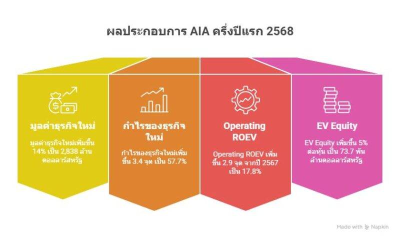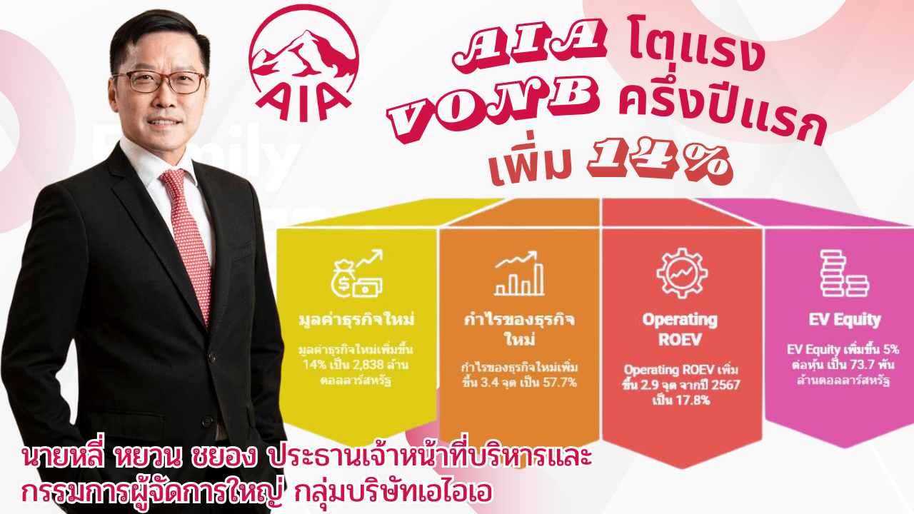 ในช่วง 6 เดือนแรกของปี 2568 มูลค่าธุรกิจใหม่ (Value of New Business – VONB) ของกลุ่มบริษัทเอไอเอเติบโต 14% อยู่ที่ 2,838 ล้านเหรียญสหรัฐ ขณะที่กำไรของธุรกิจใหม่ปรับตัวขึ้น 3.4 จุด มาอยู่ที่ 57.7% สะท้อนความแข็งแกร่งของโมเดลธุรกิจ และคุณภาพของผลิตภัณฑ์ประกันที่ตอบโจทย์ความต้องการของผู้บริโภค