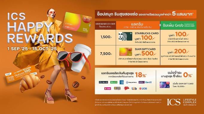 ICS Lifestyle Complex ตรงข้ามไอคอนสยาม เอาใจขาช้อปและนักชิม ด้วยโปรโมชั่นส่งท้ายปลายฝนต้นหนาว “ICS HAPPY REWARDS” ให้ลูกค้าผู้เป็นสมาชิก ONESIAM เพลิดเพลินกับการใช้จ่าย แล้วแลกรับของรางวัลสุดพิเศษ มูลค่ารวมกว่า 500,000 บาท เติมความสุขให้อิ่มอร่อยและช็อปปิ้งแบบคุ้ม ๆ ตั้งแต่วันที่ 1 กันยายน 2568– 15 ตุลาคม 2568