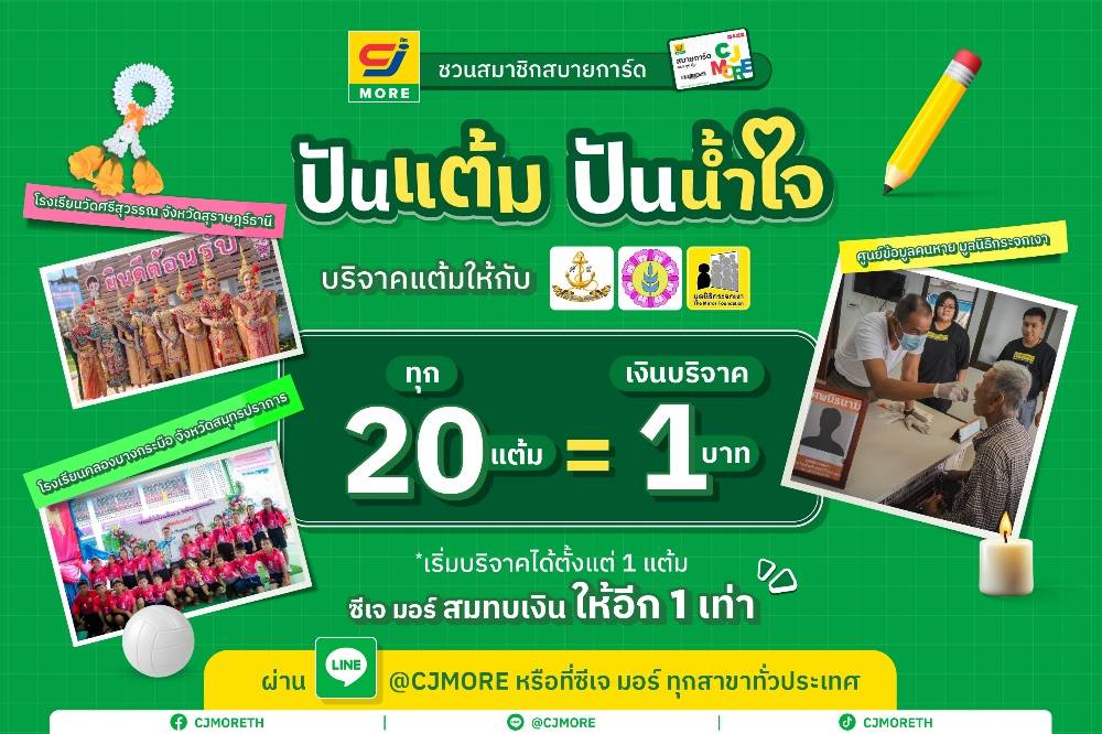 ซีเจ มอร์ (CJ MORE) เดินหน้าสานต่อเจตนารมณ์การสร้างสังคมแห่งการแบ่งปัน ผ่านโครงการ “ปันแต้ม ปันน้ำใจ” ที่เปิดโอกาสให้สมาชิกสบายการ์ดได้ร่วมส่งต่อแต้มสะสมแทนพลังน้ำใจ ระหว่างวันที่ 1 กันยายน – 31 ตุลาคม 2568 โดยทุกแต้มที่สมาชิกบริจาคผ่าน LINE Official Account @CJMORE หรือคลิก https://tinyurl.com/33jperd3 จะถูกนำไปเปลี่ยนเป็นโอกาสสำหรับผู้ที่ขาดแคลน เริ่มต้นบริจาคง่าย ๆ เพียง 1 แต้ม (20 แต้ม = 1 บาท) และเพื่อให้การช่วยเหลือเกิดผลมากยิ่งขึ้น ซีเจ มอร์ ยังสมทบเพิ่มให้อีก 1 เท่า ด้วยความตั้งใจที่จะเป็นเพียงสื่อกลางเล็ก ๆ ระหว่างลูกค้าและชุมชน โดยมุ่งเน้น 3 ภารกิจสำคัญ ทั้งในระดับชุมชนท้องถิ่นและสังคมโดยรวม ได้แก่