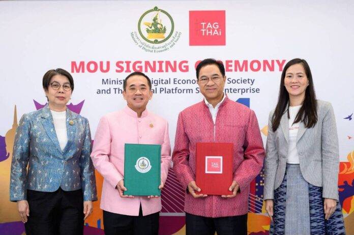 ศาสตราจารย์พิเศษวิศิษฏ์ วิศิษฏ์สรอรรถ ปลัดกระทรวงดิจิทัลเพื่อเศรษฐกิจและสังคม (ดีอี) ร่วมลงนามบันทึกข้อตกลงความร่วมมือกับ นายกลินท์ สารสิน ประธานคณะจัดการบริษัท ไทย ดิจิทัล แพลตฟอร์ม วิสาหกิจเพื่อสังคม จำกัด (TAGTHAi) เพื่อยกระดับการบริการด้านการท่องเที่ยวแบบครบวงจรผ่านแพลตฟอร์มดิจิทัล