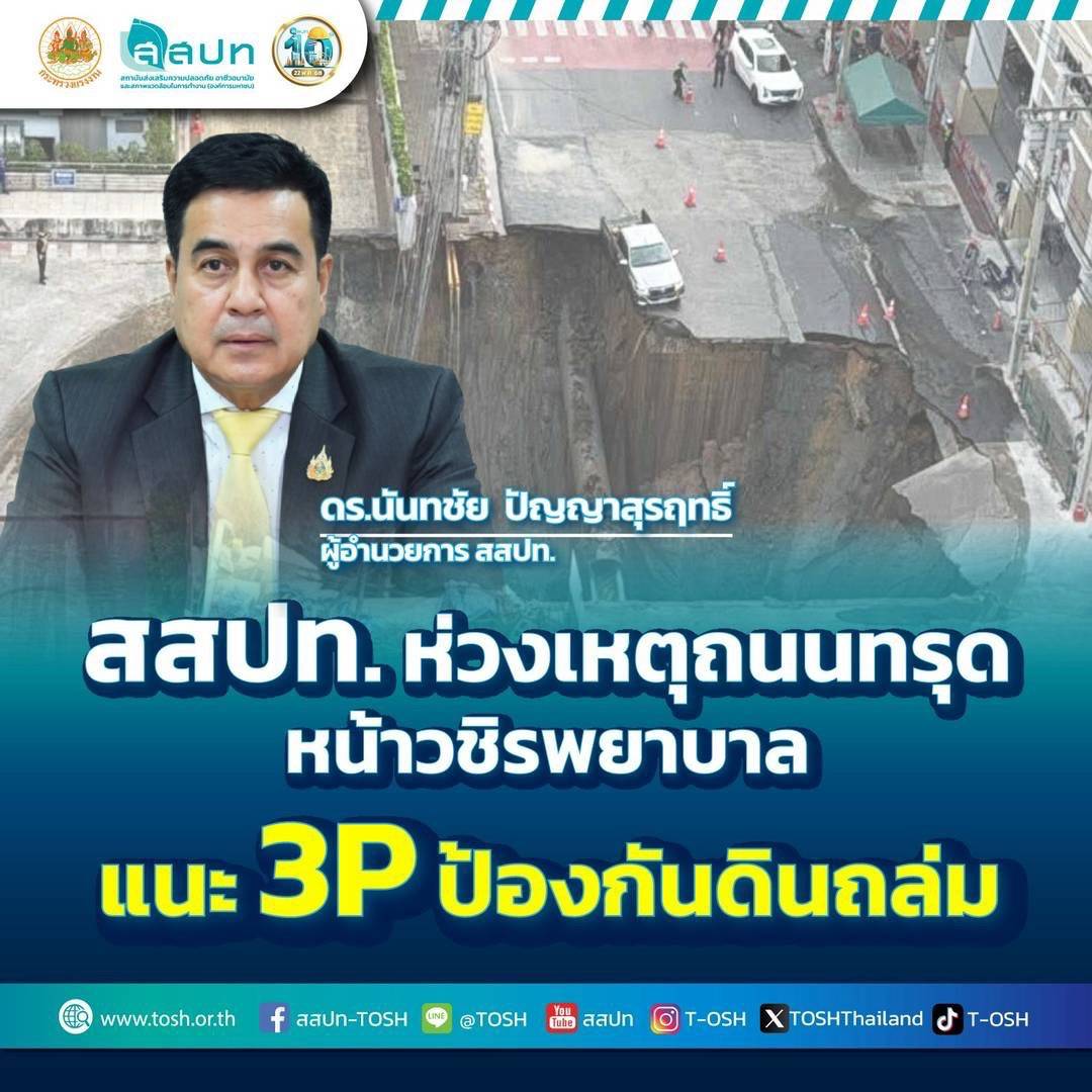 ดร.นันทชัย ปัญญาสุรฤทธิ์ ผู้อำนวยการ สสปท. กล่าวเพิ่มเติมว่า “เหตุการณ์ถนนทรุดตัวครั้งนี้ เป็นเครื่องย้ำเตือนให้ทุกฝ่ายที่เกี่ยวข้องกับงานก่อสร้างต้องตระหนักถึงความปลอดภัยเป็นอันดับแรก โดยเฉพาะในพื้นที่ที่มีการขุดเจาะลงไปใต้ดิน ขอให้ยึดหลัก 3P เป็นแนวทางปฏิบัติ เพื่อป้องกันความเสียหายที่อาจเกิดขึ้นกับทั้งชีวิตและทรัพย์สินของประชาชน”
