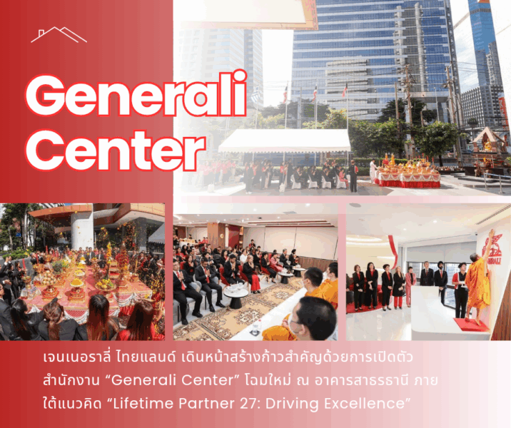 เจนเนอราลี่ ไทยแลนด์ เดินหน้าสร้างก้าวสำคัญด้วยการเปิดตัวสำนักงาน “Generali Center” โฉมใหม่ ณ อาคารสาธรธานี ภายใต้แนวคิด “Lifetime Partner 27: Driving Excellence” มุ่งยกระดับภาพลักษณ์องค์กรและเสริมศักยภาพเครือข่ายตัวแทนทั่วประเทศ
