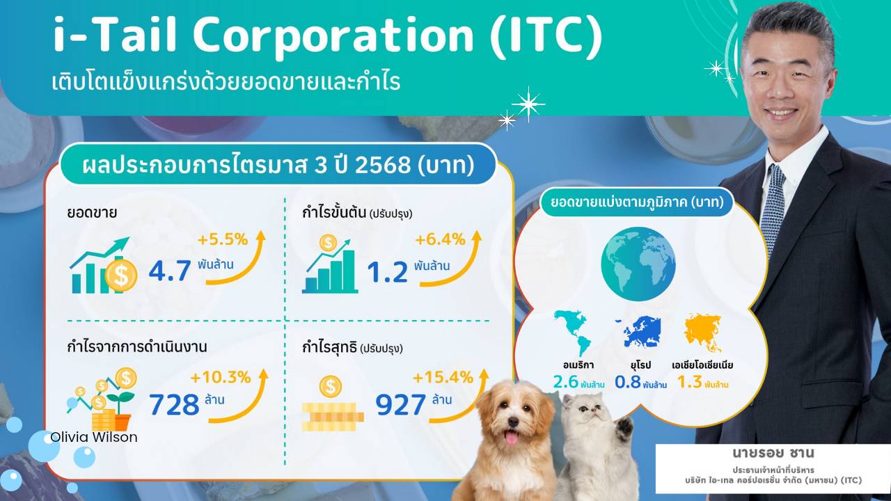 บริษัท ไอ-เทล คอร์ปอเรชั่น จำกัด (มหาชน) (ITC) ผู้นำระดับโลกในอุตสาหกรรมอาหารสัตว์เลี้ยง รายงานผลประกอบการไตรมาส 3 ปี 2568 ด้วยยอดขาย 4,721 ล้านบาท เติบโต 6.4% เมื่อเทียบกับช่วงเดียวกันของปีก่อน และเพิ่มขึ้น 5.5% จากไตรมาสก่อนหน้า โดยมียอดขายในสกุลดอลลาร์สหรัฐเพิ่มขึ้น 14.2% เมื่อเทียบกับปีก่อน อยู่ที่ 144 ล้านดอลลาร์สหรัฐ ซึ่งเป็นผลจากคำสั่งซื้อในตลาดสหรัฐอเมริกาและการขยายตลาดในยุโรป สะท้อนการเติบโตอย่างต่อเนื่องและความเชื่อมั่นจากลูกค้าแบรนด์อาหารสัตว์เลี้ยงชั้นนำ ทั้งนี้ บริษัทมีกำไรขั้นต้นปรับปรุงอยู่ที่ 1,192 ล้านบาท เพิ่มขึ้น 6.4% จากไตรมาสก่อน ขณะที่กำไรสุทธิปรับปรุงอยู่ที่ 927 ล้านบาท เพิ่มขึ้น 15.4% จากไตรมาสก่อนหน้า