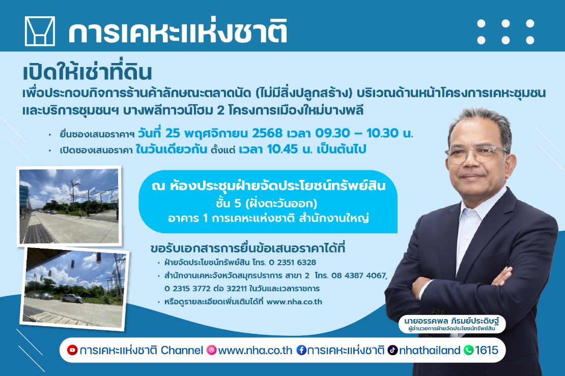การเคหะแห่งชาติ (กคช.) เดินหน้าบริหารจัดการทรัพย์สินรัฐให้เกิดประโยชน์สูงสุด เปิดให้เอกชนยื่นข้อเสนอราคาการได้สิทธิเช่าที่ดินเพื่อประกอบกิจการร้านค้าลักษณะตลาดนัด (ไม่มีสิ่งปลูกสร้าง) พร้อมกิจกรรมต่อเนื่อง บริเวณด้านหน้าโครงการเคหะชุมชนและบริการชุมชนฯ บางพลีทาวน์โฮม 2 ภายในโครงการเมืองใหม่บางพลี จังหวัดสมุทรปราการ