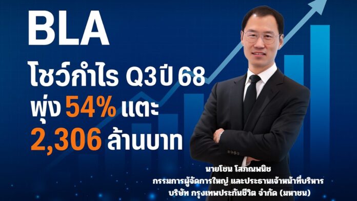 กรุงเทพประกันชีวิต จำกัด (มหาชน) หรือ BLA รายงานผลการดำเนินงานไตรมาส 3 ปี 2568 เติบโตแข็งแกร่ง มีกำไรสุทธิ 2,306 ล้านบาท เพิ่มขึ้น 808 ล้านบาท หรือคิดเป็นร้อยละ 54 จากช่วงเดียวกันของปีก่อน โดยมียอดเบี้ยประกันภัยรับปีแรก 2,761 ล้านบาท ขยายตัวสูงถึง 78% หนุนโดยช่องทางธนาคารที่เติบโตถึง 129% และช่องทางตัวแทนเพิ่มขึ้น 14% สะท้อนถึงศักยภาพของการดำเนินกลยุทธ์แบบรอบด้านที่ตอบโจทย์ผู้บริโภคในยุคใหม่