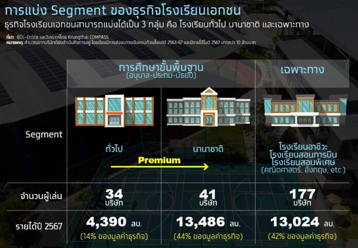 ท่ามกลางกระแสประชากรไทยที่กำลังก้าวสู่สังคมผู้สูงอายุเต็มรูปแบบ ธุรกิจโรงเรียนเอกชนกลับเป็นอีกหนึ่งอุตสาหกรรมที่ถูกจับตามองอย่างมาก เพราะเกี่ยวพันโดยตรงกับคุณภาพทุนมนุษย์ในระยะยาว และมีบทบาทต่อโครงสร้างเศรษฐกิจในอนาคต ในจำนวนนี้ “โรงเรียนนานาชาติ” กลายเป็น Segment ที่โดดเด่นที่สุดในช่วงสามปีที่ผ่านมา ทั้งด้านการเติบโตของรายได้ คุณภาพผลประกอบการ และความสามารถในการแข่งขันเหนือโรงเรียนเอกชนประเภทอื่นอย่างเห็นได้ชัด