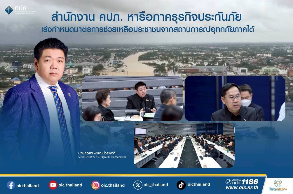 สำนักงานคณะกรรมการกำกับและส่งเสริมการประกอบธุรกิจประกันภัย (สำนักงาน คปภ.) เดินหน้าหารือภาคธุรกิจประกันภัย เพื่อกำหนดมาตรการเร่งด่วนช่วยเหลือประชาชนจากสถานการณ์อุทกภัยครั้งใหญ่ในภาคใต้ หลังเกิดความเสียหายต่อชีวิต ทรัพย์สิน และยานพาหนะจำนวนมาก