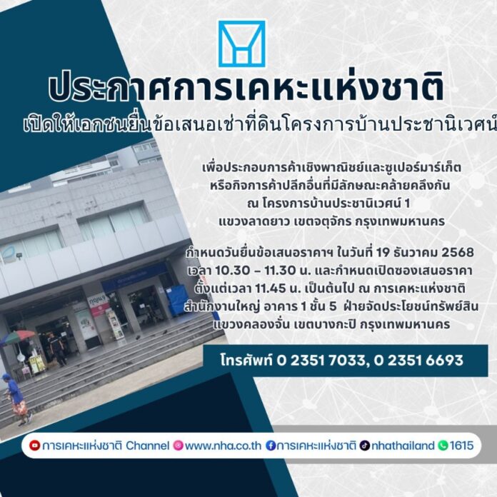 นายอรรคพล ภิรมย์ประดิษฐ์ ผู้อำนวยการฝ่ายจัดประโยชน์ทรัพย์สิน กล่าวว่า การเคหะแห่งชาติประกาศเปิดให้เอกชนยื่นข้อเสนอราคาการได้สิทธิเช่าพื้นที่ส่วนพาณิชยกรรม บริเวณชั้น 1 เพื่อประกอบการค้าเชิงพาณิชย์และซูเปอร์มาร์เก็ต หรือกิจการค้าปลีกอื่นที่มีลักษณะคล้ายคลึงกัน โครงการบ้านประชานิเวศน์ 1 โฉนดเลขที่ 2199 ขนาดเนื้อที่ประมาณ 1-0-75 ไร่ ตั้งอยู่บริเวณซอยเทศบาลนิมิตเหนือ 8 แขวงลาดยาว เขตจตุจักร กรุงเทพมหานคร เพื่อให้เกิดความโปร่งใสในการดำเนินงานทุกขั้นตอนตามหลักธรรมาภิบาล การเคหะแห่งชาติจึงเปิดโอกาสให้เอกชนที่สนใจสามารถยื่นข้อเสนอราคาการได้สิทธิเช่าที่ดินดังกล่าว โดยมีอัตราค่าธรรมเนียมการได้สิทธิเช่าขั้นต่ำ 5,800,000 บาท ระยะเวลาการให้สิทธิเช่า 15 ปี (ทำสัญญาคราวเดียว) ในอัตราค่าเช่ารายเดือน ปีที่ 1-3 เดือนละ 210,000 บาท (ปลอดค่าเช่า 3 เดือนแรก) ปีที่ 4-6 เดือนละ 250,000 บาท ปีที่ 7-9 เดือนละ 290,000 บาท ปีที่ 10-12 เดือนละ 340,000 บาท ปีที่ 13-15 เดือนละ 400,000 บาท กำหนดหลักประกันการยื่นซองเสนอราคาจำนวน 100,000 บาท กำหนดเงินประกันการปฏิบัติตามสัญญา จำนวน 1,200,000 บาท โดยกำหนดวันยื่นข้อเสนอราคาในวันที่ 19 ธันวาคม 2568 เวลา 10.30 – 11.30 น. และกำหนดเปิดซองเสนอราคา ตั้งแต่เวลา 11.45 น. เป็นต้นไป ณ การเคหะแห่งชาติ สำนักงานใหญ่ อาคาร 1 ชั้น 5 ฝ่ายจัดประโยชน์ทรัพย์สิน แขวงคลองจั่น เขตบางกะปิ กรุงเทพมหานคร
