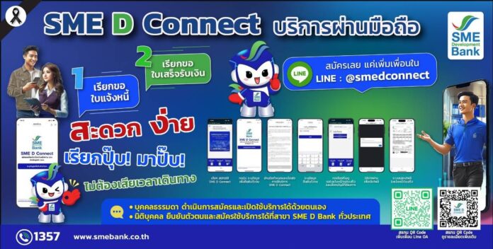ธนาคารพัฒนาวิสาหกิจขนาดกลางและขนาดย่อมแห่งประเทศไทย (ธพว.) หรือ SME D Bank เปิดบริการใหม่ “SME D Connect” อำนวยความสะดวกให้แก่ลูกค้าธนาคาร ทั้งกลุ่มบุคคลธรรมดา และนิติบุคคล สามารถเรียกขอ “ใบเสร็จรับเงิน” และ “ใบแจ้งหนี้” ได้ทันทีผ่านสมาร์ทโฟน ช่วยเพิ่มความสะดวกสบาย ไม่ต้องเสียเวลาเดินทาง เริ่มใช้งานได้ตั้งแต่วันที่ 7 มกราคม 2569 เป็นต้นไป โดยสมัครใช้งานง่ายๆ เพียงแค่ “เพิ่มเพื่อน” ในโปรแกรม LINE โดยเข้าไปที่เมนูเพิ่มเพื่อน และพิมพ์ “@smedconnect” ในช่องค้นหา โดยลูกค้ากลุ่มบุคคลธรรมดา ดำเนินการสมัครและเปิดใช้บริการได้ด้วยตัวเอง ส่วนลูกค้ากลุ่มนิติบุคคล ยืนยันตัวตนและสมัครใช้บริการครั้งแรกได้ที่สาขาของ SME D Bank ทั่วประเทศ สอบถามข้อมูลเพิ่มเติม Call Center 1357