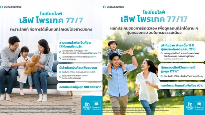 OCEAN LIFE ไทยสมุทร ฉลองครบรอบ 77 ปี เปิดตัว 2 สินค้าใหม่ “โอเชี่ยนไลฟ์ เลิฟ โพรเทค 77/7” ชูจุดเด่น จ่ายเบี้ยสั้น 7 ปี คุ้มครองชีวิตถึง 77 ปี และ “โอเชี่ยนไลฟ์ เลิฟ โพรเทค 77/17” คุ้มครองชีวิตถึง 77 ปี เบี้ยประกันเข้าถึงง่าย คุ้มครองครบ จบในกรมธรรม์เดียว