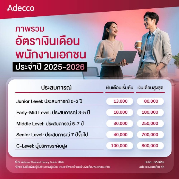 โดย อเด็คโก้ประเทศไทยเผยแพร่คู่มืออัตราเงินเดือนพนักงานเอกชนประจำปี 2569 หรือ Adecco Thailand Salary Guide 2026 รายงานที่รวบรวมอัตราเงินเดือนครอบคลุมตำแหน่งสำคัญในกลุ่มงานหลากหลาย รวมถึงเปิดเผยข้อมูลตลาดการจ้างงาน และผลสำรวจ Career & Work Trends 2025 ที่สะท้อนความคิดเห็นของคนทำงานไทยกว่า 1,500 คนทั่วประเทศ ในเรื่องแผนการเปลี่ยนงาน ค่าตอบแทน และเทรนด์การทำงานที่น่าสนใจ โดยในครั้งนี้เน้นในเรื่องการทำงานกับคนต่างวัย และรูปแบบการทำงานแบบไม่ประจำ ที่กำลังถูกพูดถึงเป็นอย่างมากในปัจจุบัน