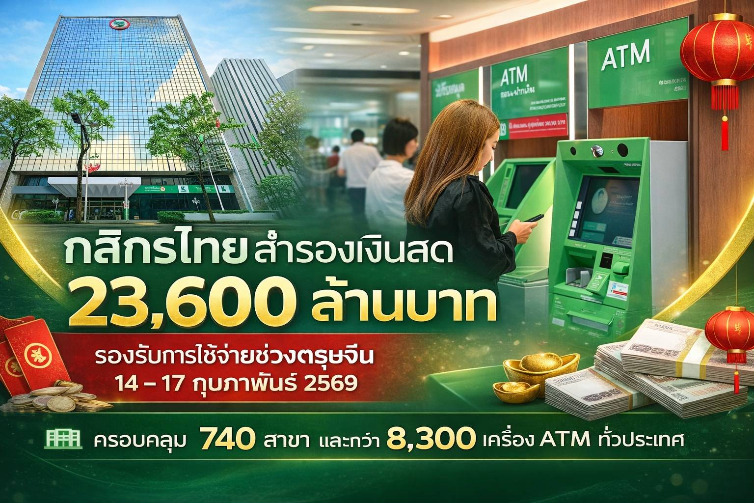 ธนาคารกสิกรไทยเตรียมความพร้อมรองรับการใช้จ่ายของประชาชนในช่วงเทศกาลตรุษจีน ระหว่างวันที่ 14–17 กุมภาพันธ์ 2569 โดยสำรองเงินสดรวมทั้งสิ้น 23,600 ล้านบาท เพื่อให้บริการผ่านสาขาและเครื่องเอทีเอ็มทั่วประเทศอย่างเพียงพอและต่อเนื่อง