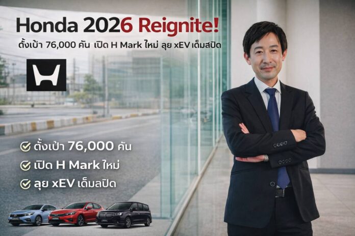 (กรุงเทพฯ – 13 กุมภาพันธ์ 2569) บริษัท ฮอนด้า ออโตโมบิล (ประเทศไทย) จำกัด ประกาศทิศทางธุรกิจปี 2569 ตั้งเป้ายอดขาย 76,000 คัน ท่ามกลางภาพรวมตลาดรถยนต์ไทยที่คาดการณ์ยอดขายรวมอยู่ที่ 630,000 คัน พร้อมเดินเกมรุกครั้งสำคัญ ทั้งการรีเฟรชภาพลักษณ์แบรนด์ด้วยโลโก้ “H mark” ใหม่ การเปิดตัวรถยนต์รุ่นใหม่อย่างน้อย 4 รุ่น และการขับเคลื่อนองค์กรด้วยเทคโนโลยีอัจฉริยะ