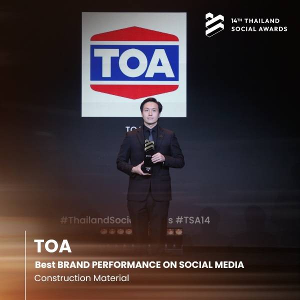 TOA ตอกย้ำผู้นำสีอันดับ 1 ของไทย หลังคว้ารางวัลชนะเลิศ “Best Brand Performance on Social Media” ในกลุ่มธุรกิจวัสดุก่อสร้าง (Construction Material) จากเวที Thailand Social Awards ครั้งที่ 14 งานประกาศรางวัลด้านโซเชียลมีเดียที่ใหญ่ที่สุดของประเทศ สะท้อนความสำเร็จกลยุทธ์คอนเทนต์ที่เข้าถึงและครองใจผู้บริโภคยุคดิจิทัลอย่างแท้จริง