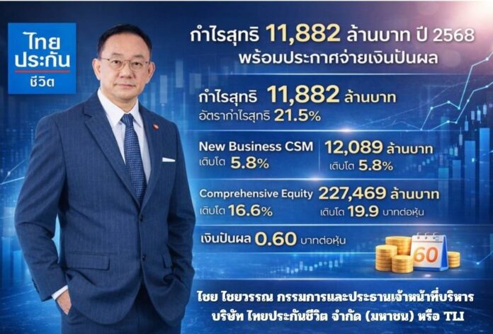 ไทยประกันชีวิต หรือ TLI เปิดผลประกอบการปี 2568 โชว์กำไรสุทธิ 11,882 ล้านบาท คิดเป็นอัตรากำไรสุทธิ 21.5% ตอกย้ำความสามารถทำกำไรต่อเนื่องท่ามกลางความผันผวนของตลาดการเงิน ขณะที่มูลค่ากำไรของธุรกิจใหม่ (VONB) อยู่ที่ 7,101 ล้านบาท และกำไรจากการให้บริการตามสัญญาจากกรมธรรม์ใหม่ (New Business CSM) แตะ 12,089 ล้านบาท สะท้อนคุณภาพพอร์ตขายที่มุ่งเน้นผลิตภัณฑ์สร้างมูลค่าระยะยาว