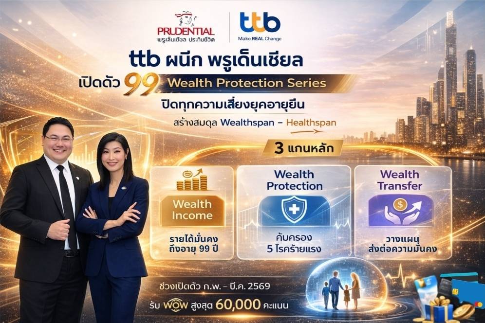 ธนาคารทหารไทยธนชาต หรือ ทีทีบี เดินหน้าตอกย้ำพันธกิจการสร้างชีวิตทางการเงินที่ดีขึ้นให้คนไทย ผนึกกำลังพันธมิตรระดับโลก พรูเด็นเชียล ประเทศไทย เปิดตัวซีรีส์ประกันชีวิตใหม่ “99 Wealth Protection Series” ภายใต้แนวคิด “ออกแบบชีวิตที่มั่นคง ครบทุกความต้องการ” รองรับโลกยุค Longevity Era ที่คนไทยมีอายุยืนยาวขึ้น มุ่งสร้างความมั่นคงทางการเงินระยะยาว (Wealthspan) ควบคู่สุขภาพที่ดี (Healthspan)