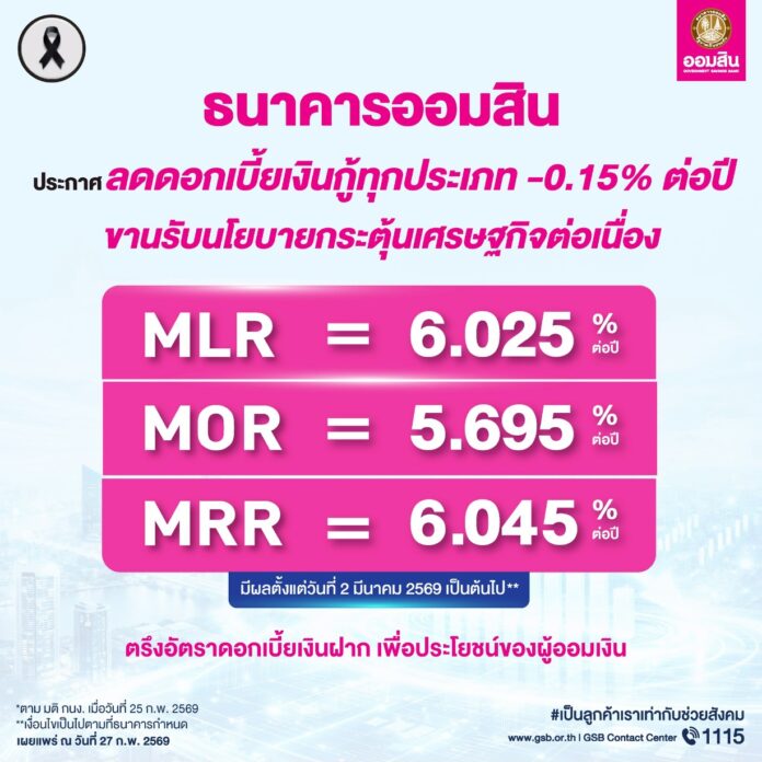 นางลภาวรรณ จันทร์กระจ่าง รองผู้อำนวยการธนาคารออมสิน รักษาการแทนผู้อำนวยการธนาคารออมสิน เปิดเผยว่า ธนาคารประกาศลดอัตราดอกเบี้ยเงินกู้อีกครั้งในรอบ 2 เดือน เพื่อสนับสนุนนโยบายกระตุ้นการฟื้นตัวของเศรษฐกิจอย่างต่อเนื่อง และช่วยบรรเทาภาระหนี้ ตามมติคณะกรรมการนโยบายการเงิน (กนง.) และสอดคล้องตามนโยบายกระทรวงการคลัง โดยครั้งนี้ธนาคารปรับลดดอกเบี้ยเงินกู้ทุกประเภทสินเชื่อลง 0.15% ต่อปี ส่งผลให้อัตราดอกเบี้ยเงินกู้ขั้นต่ำประเภทเงินกู้ที่มีระยะเวลา (MLR) ลดเหลือ 6.025% ต่อปี อัตราดอกเบี้ยเงินกู้ขั้นต่ำประเภทเงินเบิกเกินบัญชี (MOR) ลดเหลือ 5.695% ต่อปี และอัตราดอกเบี้ยเงินกู้ลูกค้ารายย่อยชั้นดี (MRR) ลดเหลือ 6.045% ต่อปี ซึ่งนับเป็นอัตราดอกเบี้ยเงินกู้ทุกประเภทแตะระดับต่ำสุดในระบบสถาบันการเงิน ทั้งธนาคารพาณิชย์และสถาบันการเงินของรัฐ มีผลตั้งแต่วันที่ 2 มีนาคม 2569 เป็นต้นไป โดยธนาคารออมสินพร้อมสนับสนุนการปล่อยสินเชื่อเติมสภาพคล่องเข้าสู่ระบบเศรษฐกิจที่กำลังมีแนวโน้มเติบโตดีขึ้นอย่างต่อเนื่อง สำหรับการลดดอกเบี้ยเงินกู้ในครั้งนี้ ตั้งเป้าช่วยลดต้นทุนทางการเงินของผู้ประกอบการ SMEs และผู้ประกอบการรายย่อยให้สามารถดำเนินธุรกิจคล่องตัวและเพิ่มขีดความสามารถในการแข่งขัน ทั้งยังเป็นการบรรเทาภาระหนี้แก่ลูกหนี้รายย่อยและกระตุ้นการบริโภค ซึ่งจะส่งผลดีต่อการขับเคลื่อนการเติบโตเศรษฐกิจในภาพรวม ผู้ประกอบการและบุคคลทั่วไปที่สนใจยื่นขอกู้สินเชื่อธนาคารออมสิน สามารถติดต่อที่ธนาคารออมสินทุกสาขา สอบถามข้อมูลเพิ่มเติมได้ที่ GSB Contact Center โทร. 1115