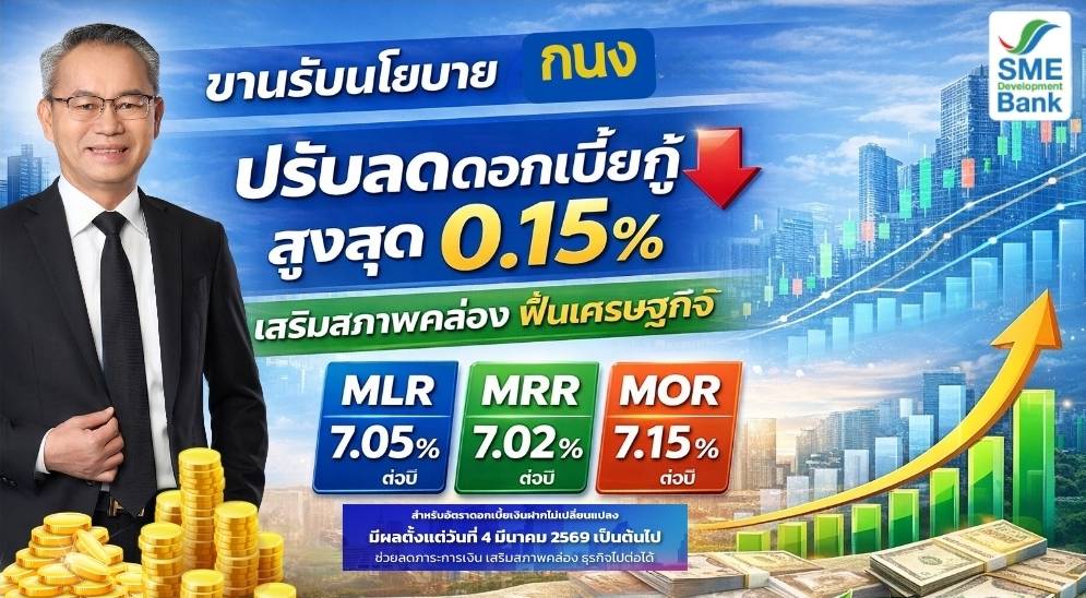 SME D Bank ขานรับนโยบายผ่อนคลายทางการเงิน หลังที่ประชุมคณะกรรมการนโยบายการเงิน (กนง.) ภายใต้การกำกับของ ธนาคารแห่งประเทศไทย มีมติเมื่อวันที่ 25 กุมภาพันธ์ 2569 ปรับลดอัตราดอกเบี้ยนโยบายลง 0.25% ต่อปี จาก 1.25% เหลือ 1.00% ต่อปี เพื่อสนับสนุนการฟื้นตัวทางเศรษฐกิจ
