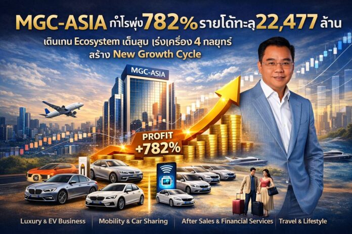 MGC-ASIA ประกาศผลการดำเนินงานปี 2568 สุดร้อนแรง สร้างสถิติกำไรเติบโตถึง 782% พร้อมรายได้รวมทะลุ 22,477 ล้านบาท สะท้อนพลังของโครงสร้างธุรกิจแบบครบวงจรภายใต้แนวคิด Mobility Ecosystem ที่เชื่อมต่อทุกห่วงโซ่ ตั้งแต่จำหน่ายรถยนต์พรีเมียม–ลักชัวรี รถยนต์ไฟฟ้า ธุรกิจการเงิน ประกันภัย บริการหลังการขาย ไปจนถึงรถเช่า