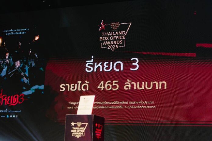 กรุงเทพฯ – สร้างปรากฏการณ์ครั้งสำคัญให้วงการภาพยนตร์ไทย เมื่อ M Studio และ ช่อง 3 คว้ารางวัลภาพยนตร์ทำรายได้สูงสุดแห่งปี 2025 จากเวที Thailand Box Office Awards 2025 ด้วยผลงานภาพยนตร์เรื่อง “ธี่หยด 3” ที่ทำรายได้รวมทั่วประเทศสูงถึง 465 ล้านบาท ตอกย้ำความแข็งแกร่งของแฟรนไชส์สยองขวัญระดับปรากฏการณ์ที่ครองใจผู้ชมทั่วประเทศ