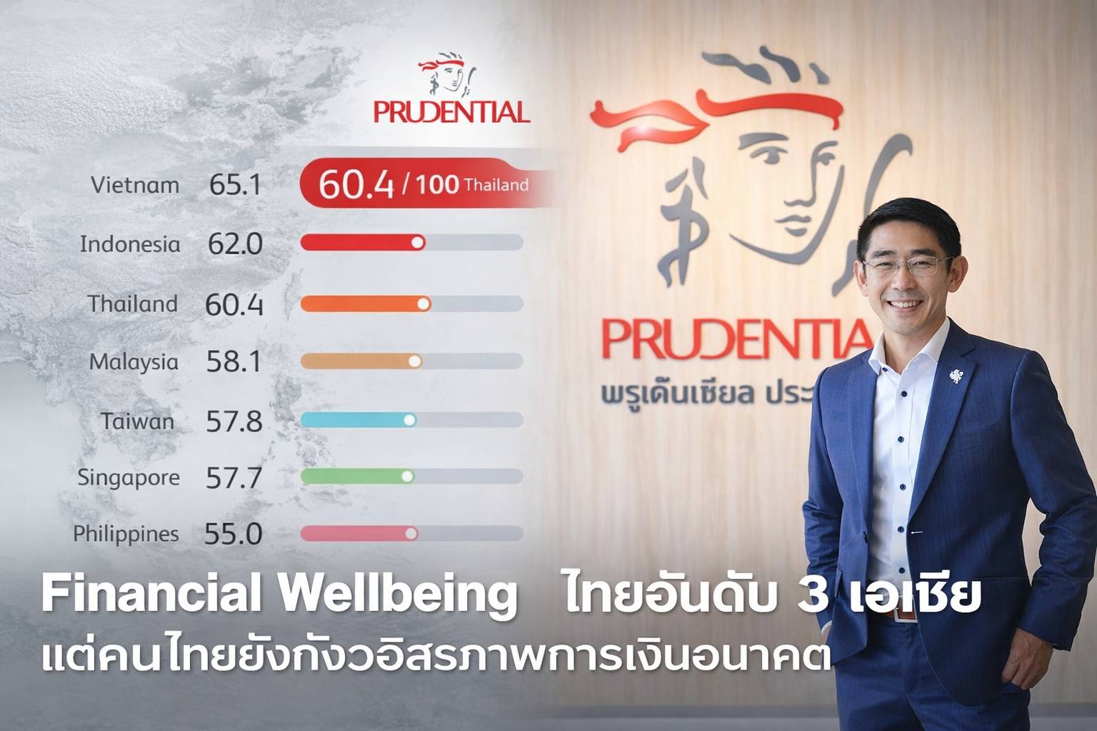กลุ่มบริษัท Prudential plc หรือพรูเด็นเชียล เปิดเผยผลวิจัยล่าสุดเกี่ยวกับ “ความเป็นอยู่ที่ดีทางการเงิน” หรือ Financial Wellbeing พบว่า ประเทศไทยมีระดับความเป็นอยู่ทางการเงินอยู่ใน อันดับ 3 ของเอเชีย ด้วยคะแนน 60.4 จาก 100 รองจากเวียดนามและอินโดนีเซีย สะท้อนว่าคนไทยจำนวนมากสามารถบริหารจัดการสถานะทางการเงินในชีวิตประจำวันได้ในระดับที่ดี ทั้งในด้านการควบคุมค่าใช้จ่าย การออม และการตัดสินใจทางการเงินเพื่อรักษาคุณภาพชีวิตในปัจจุบัน