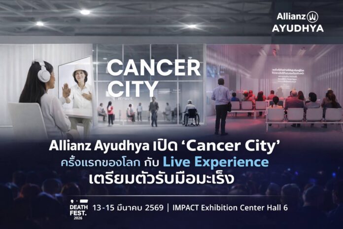 อลิอันซ์ อยุธยา ประกันชีวิต เปิดพื้นที่เรียนรู้รูปแบบใหม่ ชวนคนไทยทำความเข้าใจและเตรียมความพร้อมรับมือโรคมะเร็ง ผ่านโซนกิจกรรมพิเศษ “Cancer City: Live Experience เตรียมตัวเป็นมะเร็ง” ภายในงาน Death Fest 2026 ซึ่งจัดขึ้นระหว่างวันที่ 13 – 15 มีนาคม 2569 เวลา 09.00 – 19.00 น. ณ IMPACT Exhibition Center Hall 6 เพื่อเปิดมุมมองเกี่ยวกับโรคมะเร็ง และสร้างความตระหนักถึงความสำคัญของการเตรียมความพร้อมด้านสุขภาพและการวางแผนชีวิต