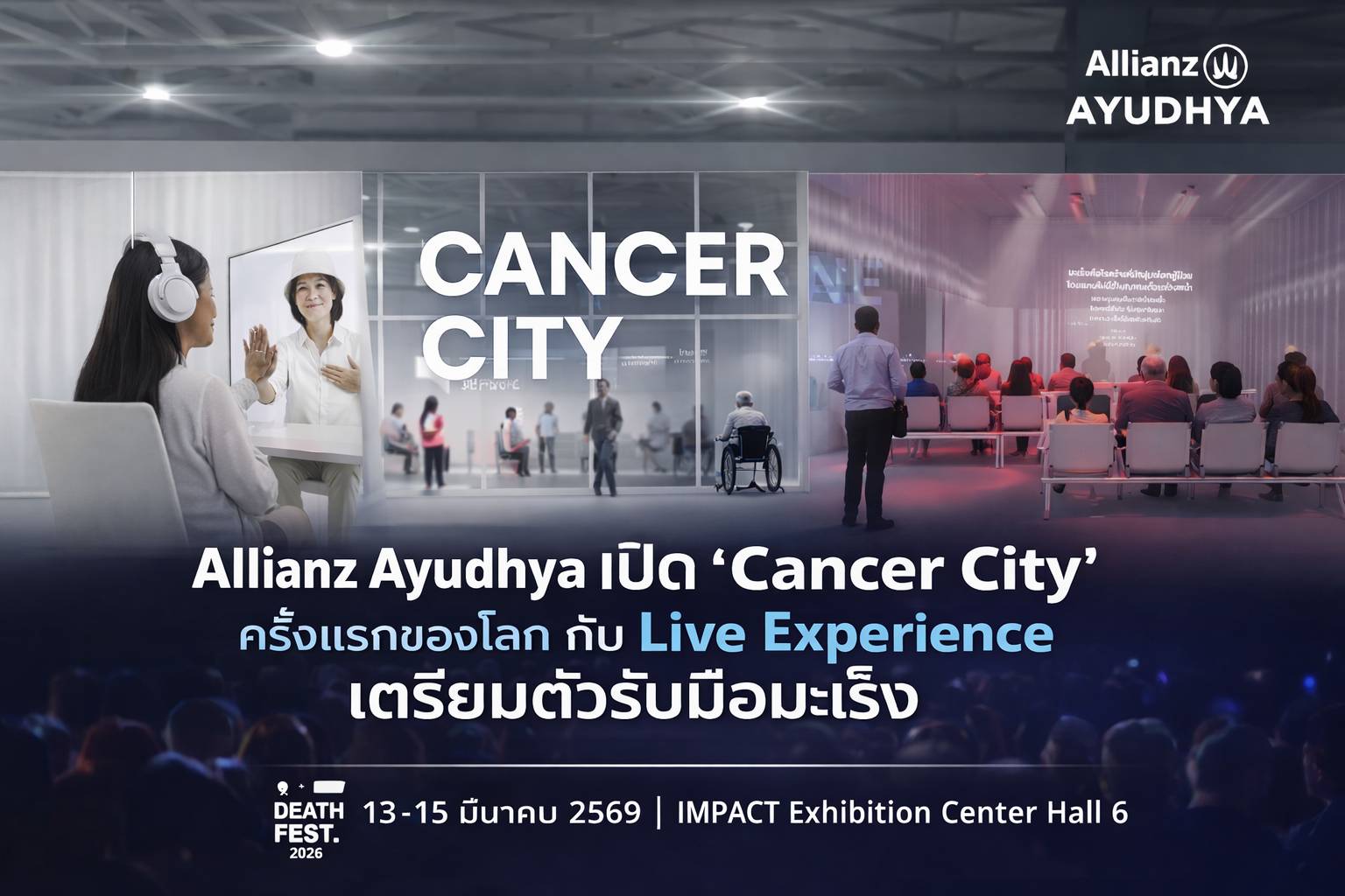 ทั้งนี้ การเข้าร่วมงาน Death Fest 2026 และกิจกรรม Cancer City Live Experience by Allianz Ayudhya สะท้อนบทบาทของอลิอันซ์ อยุธยา ในการสนับสนุนให้คนไทยมีความรู้ ความเข้าใจ และความพร้อมในการรับมือกับความเสี่ยงด้านสุขภาพ พร้อมส่งเสริมการวางแผนชีวิตและการดูแลสุขภาพอย่างยั่งยืน ผู้สนใจสามารถเข้าร่วมกิจกรรมได้ภายในงาน ระหว่างวันที่ 13 – 15 มีนาคม 2569 เวลา 09.00 – 19.00 น. ณ IMPACT Exhibition Center Hall 6