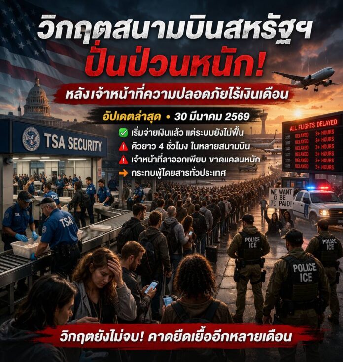 ในวันที่ 29 มีนาคม 2569 หลายสนามบินหลักของสหรัฐฯ เผชิญความปั่นป่วนอย่างหนัก ผู้โดยสารต้องรอคิวตรวจความปลอดภัยยาวนานหลายชั่วโมง บางแห่งมีเวลารอสูงสุดกว่า 210 นาที และในบางกรณีคิวยาวเกิน 4 ชั่วโมง