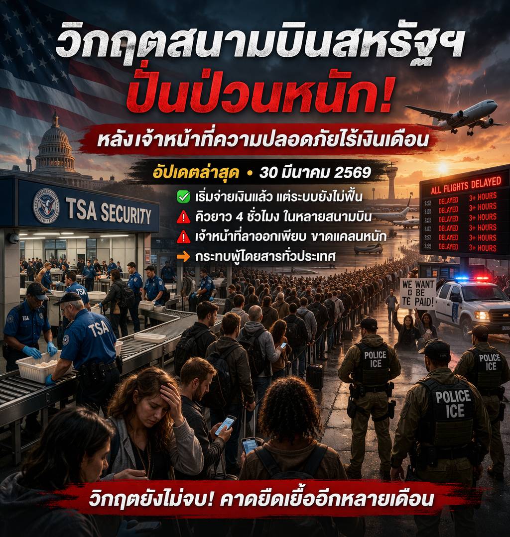 จาก “เจ้าหน้าที่ไร้เงินเดือน” ในช่วง Government Shutdown สู่ “สนามบินปั่นป่วนทั่วประเทศ” ในวันที่ 29 มีนาคม และแม้วันที่ 30 มีนาคมจะเริ่มมีการจ่ายเงินและสัญญาณคลี่คลายบางส่วน แต่ระบบโดยรวมยังไม่ฟื้นตัว โดยยังเผชิญแรงกดดันจากการขาดแคลนบุคลากรและความไม่แน่นอนทางการเมืองอย่างต่อเนื่อง
