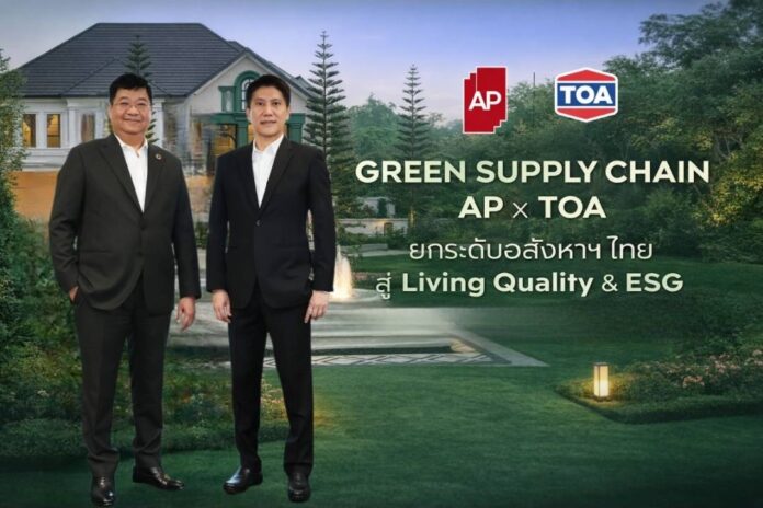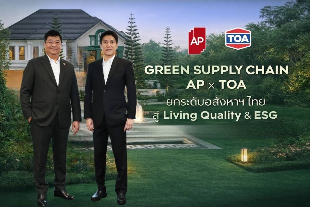 เอพี ไทยแลนด์ ผนึกกำลัง ทีโอเอ เพ้นท์ (ประเทศไทย) ประกาศความร่วมมือเชิงกลยุทธ์ สร้าง “Green Supply Chain” ยกระดับมาตรฐานอุตสาหกรรมอสังหาริมทรัพย์ไทย มุ่งผสาน “คุณภาพชีวิต–สิ่งแวดล้อม–การเติบโตธุรกิจ” อย่างสมดุล ผ่านการคัดเลือกวัสดุก่อสร้างรักษ์โลก และนวัตกรรมที่ช่วยลดการใช้พลังงานในที่อยู่อาศัย