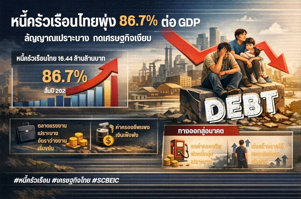 หนี้ครัวเรือนไทยกำลังส่งสัญญาณ “น่ากังวลมากขึ้น” หลังตัวเลขล่าสุด ณ สิ้นปี 2025 ขยับขึ้นแตะ 86.7% ต่อ GDP อีกครั้ง แม้จะเป็นการขยายตัวเพียงเล็กน้อยที่ 0.05%YOY แต่สิ่งที่ซ่อนอยู่เบื้องหลัง กลับสะท้อนภาพเศรษฐกิจฐานรากที่ยังไม่ฟื้นเต็มที่ และกำลังเผชิญแรงกดดันรอบด้าน