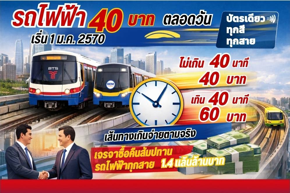 โดยตั้งเป้าหมายเริ่มใช้นโยบายรถไฟฟ้า “40 บาทตลอดวัน” ครอบคลุมทุกสีทุกสาย ภายในวันที่ 1 มกราคม 2570 เป็นของขวัญปีใหม่ให้ประชาชน