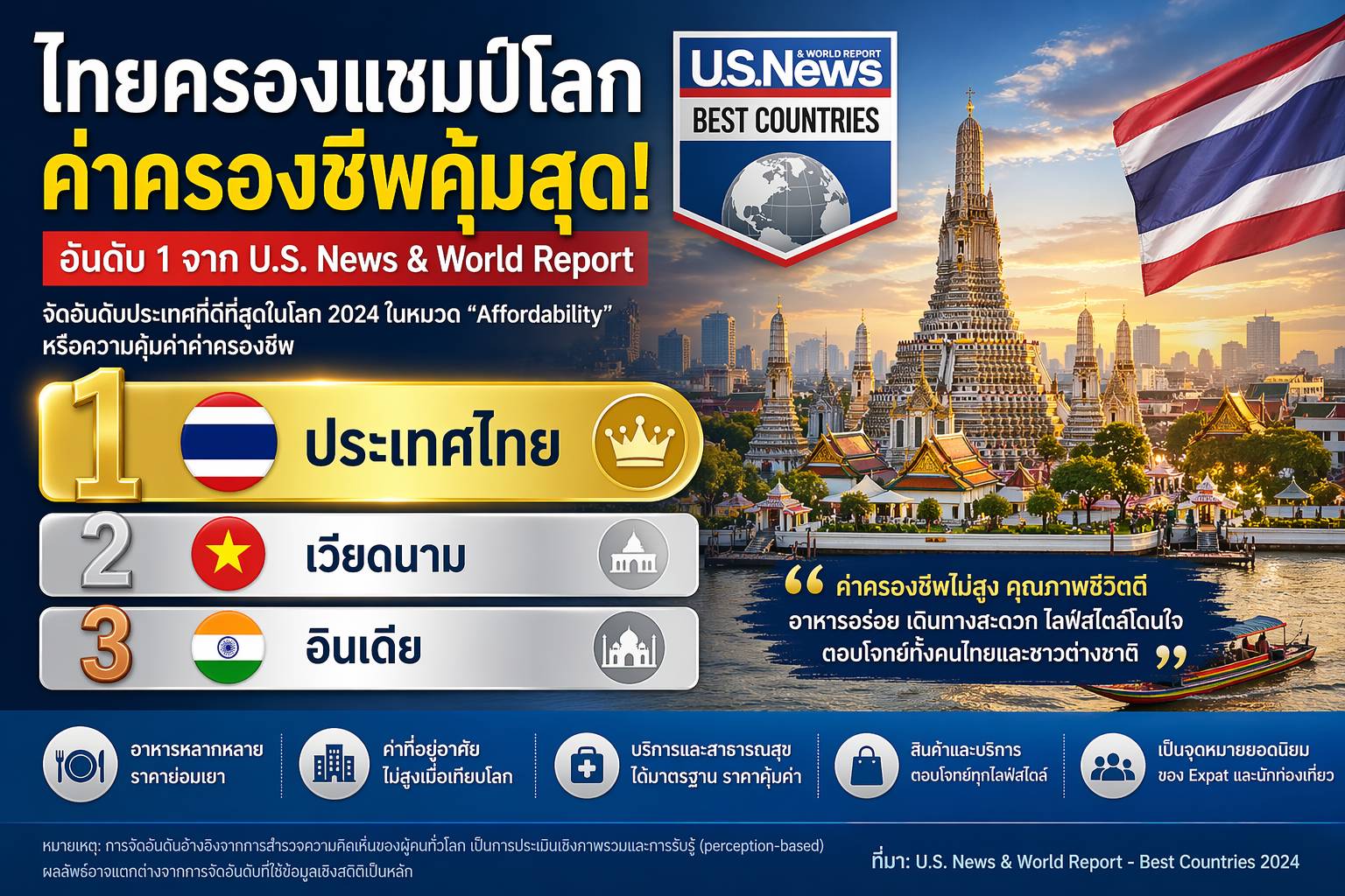 กรุงเทพฯ – รายงานการจัดอันดับประเทศที่ดีที่สุดในโลก (Best Countries) โดย U.S. News & World Report เปิดเผยผลการจัดอันดับด้าน “Affordability” หรือความคุ้มค่าค่าครองชีพ พบว่า ประเทศไทยครองอันดับ 1 ของโลก ขณะที่อันดับ 2 และ 3 ได้แก่ เวียดนาม และ อินเดีย ตามลำดับ