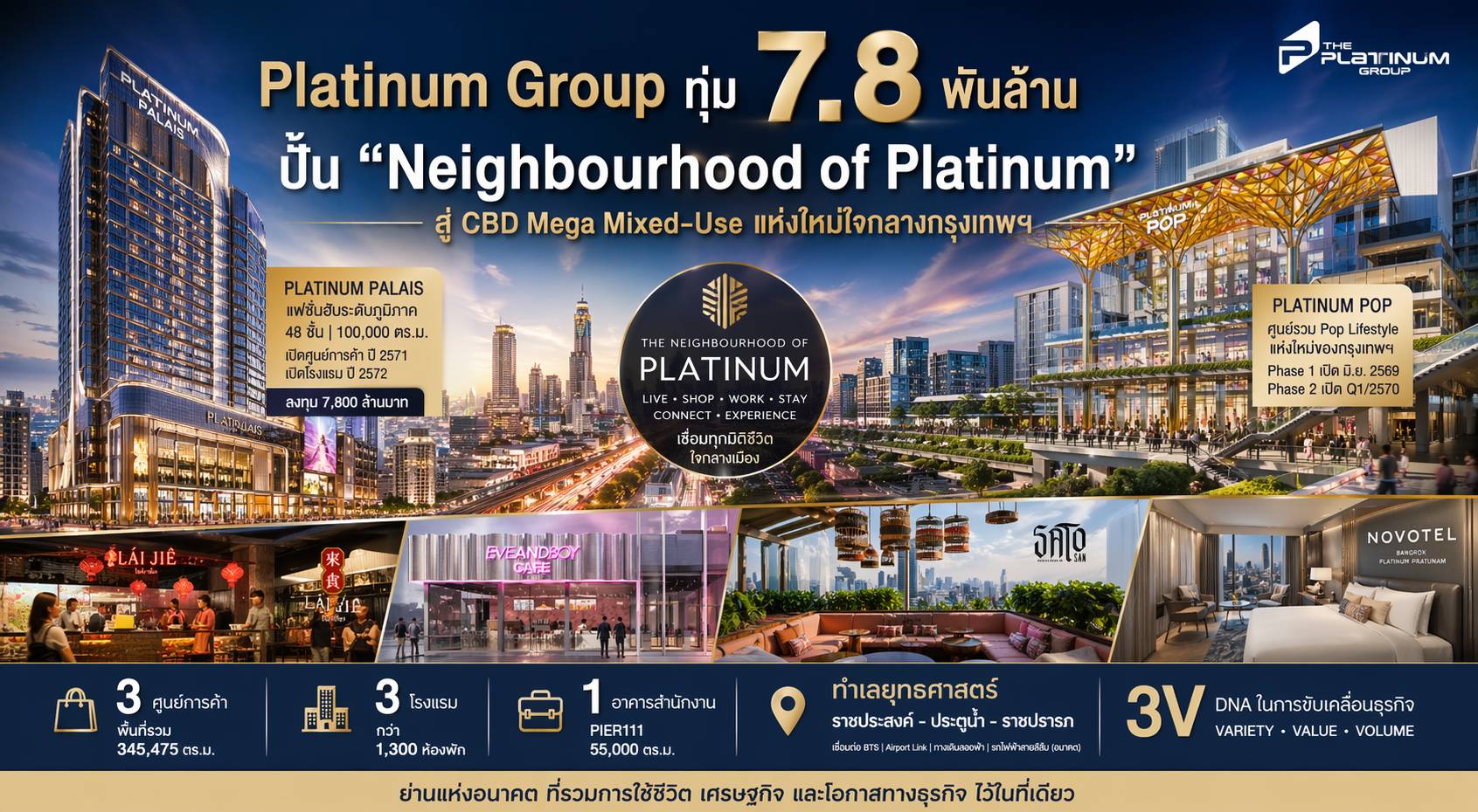 บริษัท The Platinum Group เดินเกมรุกครั้งใหญ่ ประกาศยุทธศาสตร์ปั้นย่านราชประสงค์–ประตูน้ำ–ราชปรารภ ให้กลายเป็นแลนด์มาร์กระดับโลก ภายใต้คอนเซ็ปต์ “The Neighbourhood of Platinum” ยกระดับสู่ CBD Mega Mixed-Use Ecosystem ใจกลางเมือง เชื่อมศูนย์การค้า โรงแรม และอาคารสำนักงานเข้าด้วยกันอย่างครบวงจร