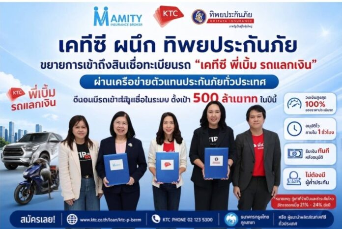 กรุงเทพฯ – เคทีซี เดินหน้าขยายโอกาสการเข้าถึงสินเชื่อในระบบสำหรับผู้ถือครองรถยนต์และรถจักรยานยนต์ทั่วประเทศ จับมือกับ ทิพยประกันภัย เปิดช่องทางให้บริการสินเชื่อทะเบียนรถ “เคทีซี พี่เบิ้ม รถแลกเงิน” ผ่านเครือข่ายตัวแทนประกันภัย หวังเพิ่มความสะดวก โปร่งใส และลดข้อจำกัดในการเข้าถึงแหล่งเงินทุน โดยตั้งเป้าสร้างยอดสินเชื่อใหม่ 500 ล้านบาทภายในปีนี้