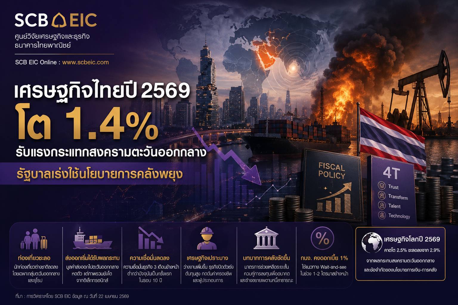ศูนย์วิจัยเศรษฐกิจและธุรกิจ ธนาคารไทยพาณิชย์ (SCB EIC) ประเมินเศรษฐกิจไทยปี 2569 ยังเผชิญแรงกดดันรอบด้าน โดยเฉพาะผลกระทบจากความขัดแย้งในตะวันออกกลางที่เริ่มส่งผลชัดเจนมากขึ้น พร้อมคงคาดการณ์ GDP เติบโตเพียง 1.4% ท่ามกลางความเปราะบางของเศรษฐกิจและความไม่แน่นอนที่ยังอยู่ในระดับสูง