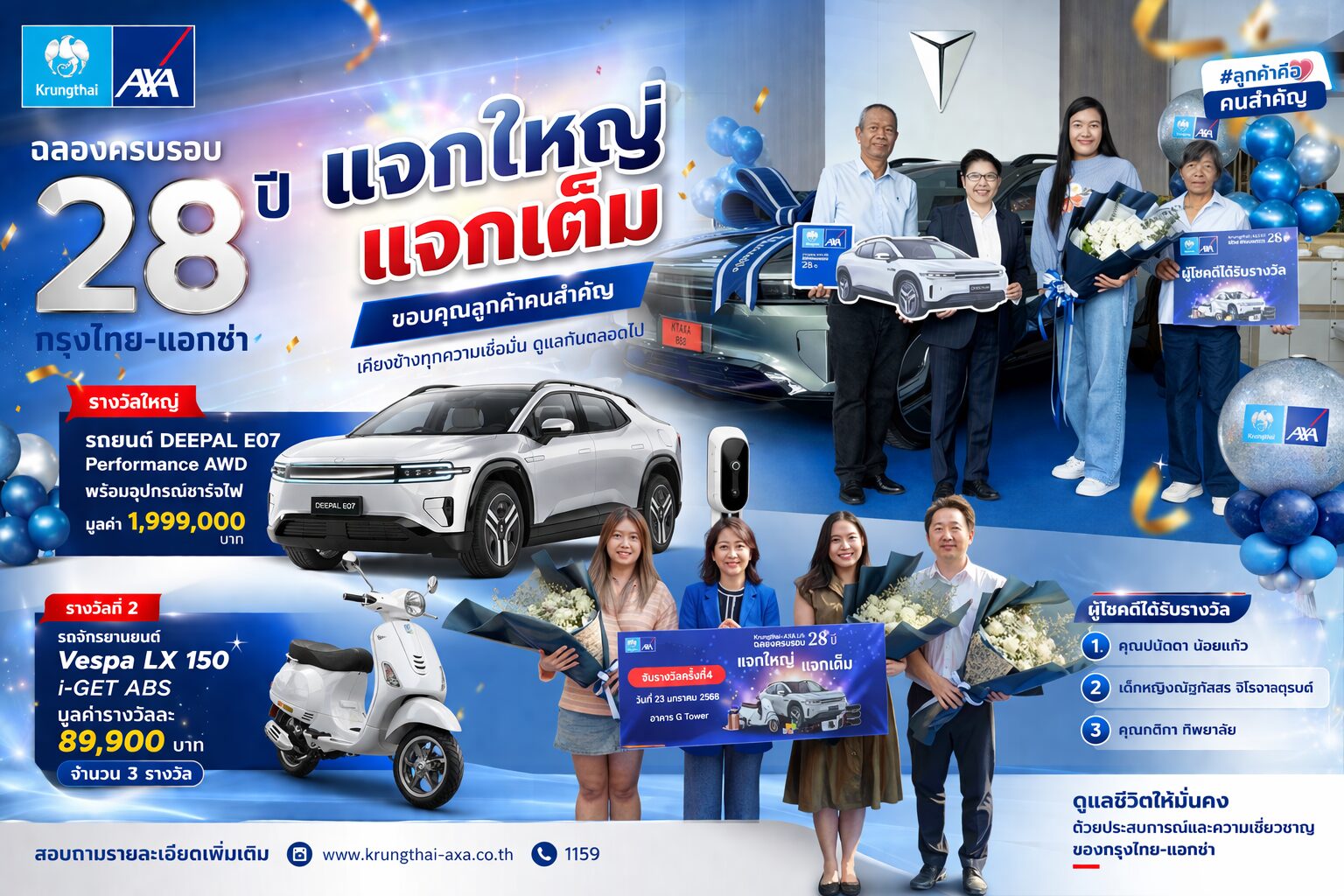 บริษัท กรุงไทย-แอกซ่า ประกันชีวิต จำกัด (มหาชน) เดินหน้าสร้างความประทับใจให้ลูกค้าอย่างต่อเนื่อง ล่าสุดจัดพิธีมอบรางวัลใหญ่จากแคมเปญ “ฉลองครบรอบ 28 ปี กรุงไทย-แอกซ่า แจกใหญ่ แจกเต็ม” เพื่อขอบคุณลูกค้าที่ไว้วางใจให้บริษัทดูแลมาโดยตลอด